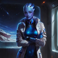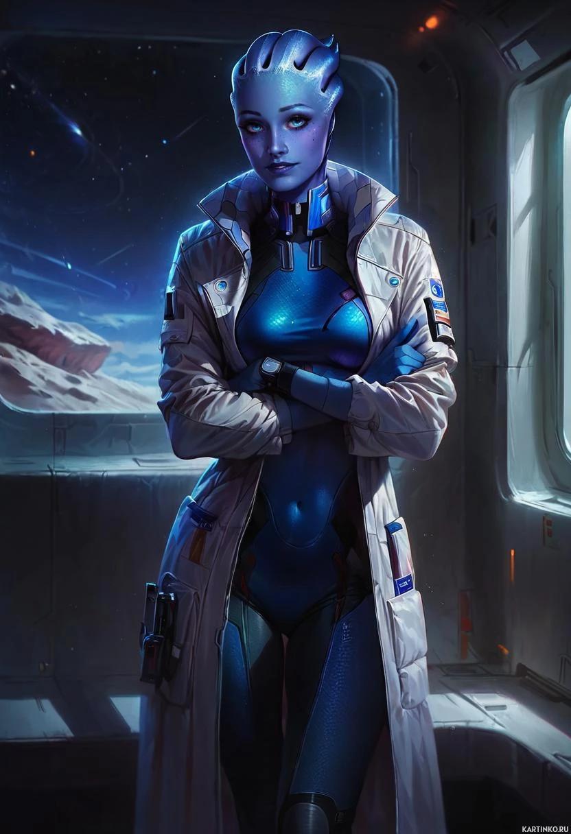 space suit with a helmet featuring a visor, suggesting they might be involved in some form of interstellar exploration or mission. They have blue skin and are wearing an olive-colored