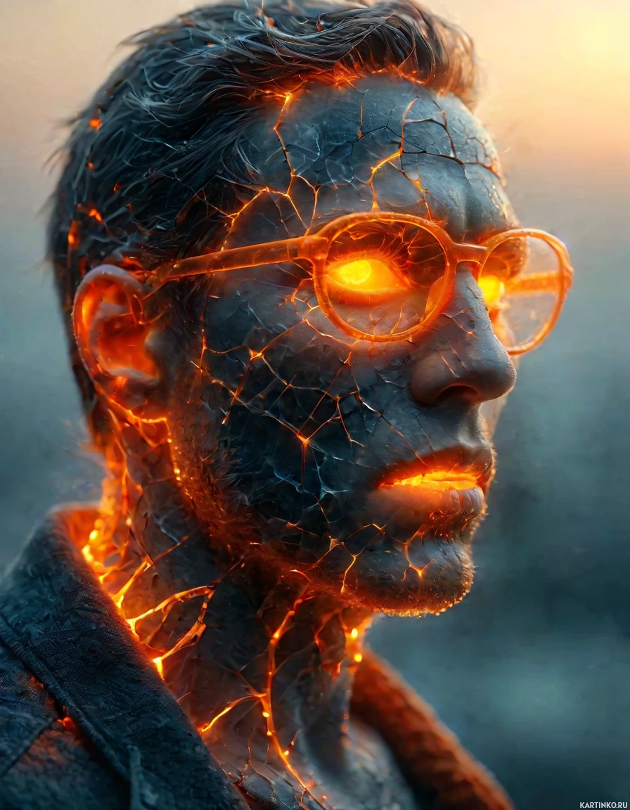 The image features a man with striking red and yellow electric-like patterns emanating from his head and neck area. He is wearing glasses, has
