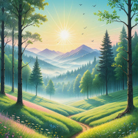 forest scene at what appears to be either sunrise or sunset, given the warm lighting. In the foreground, there's a well-