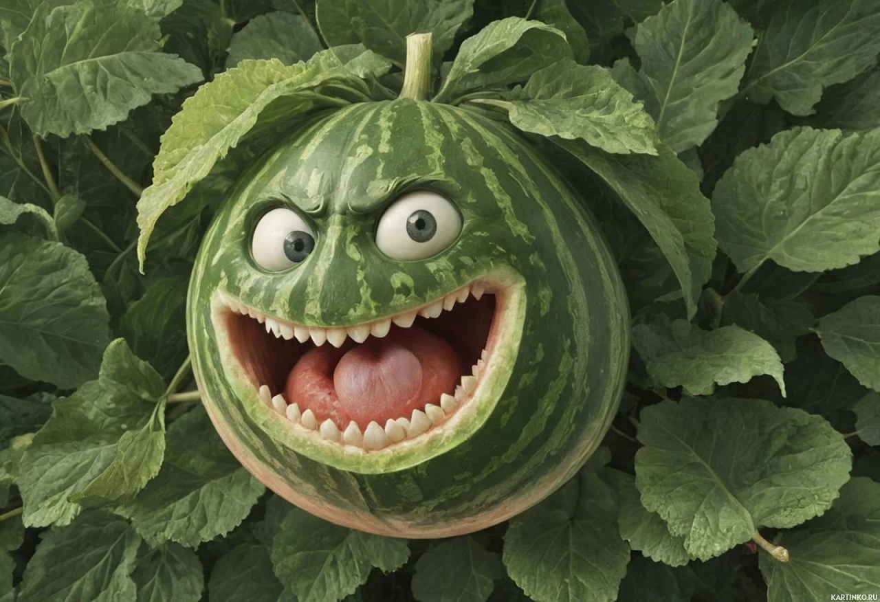 expressive eyes and a wide-open mouth, showing teeth as if it's smiling or making a surprised expression. The watermelon is set against a lush green backdrop that resembles
