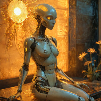 circular ornament or clock. The lighting is subdued, giving the scene an atmospheric quality. On the bench next to the robot are some items that include a vase with flowers and what seems to be a glass cup or mug. The overall tone of the image suggests