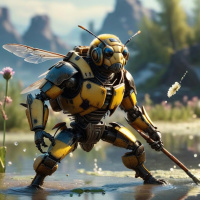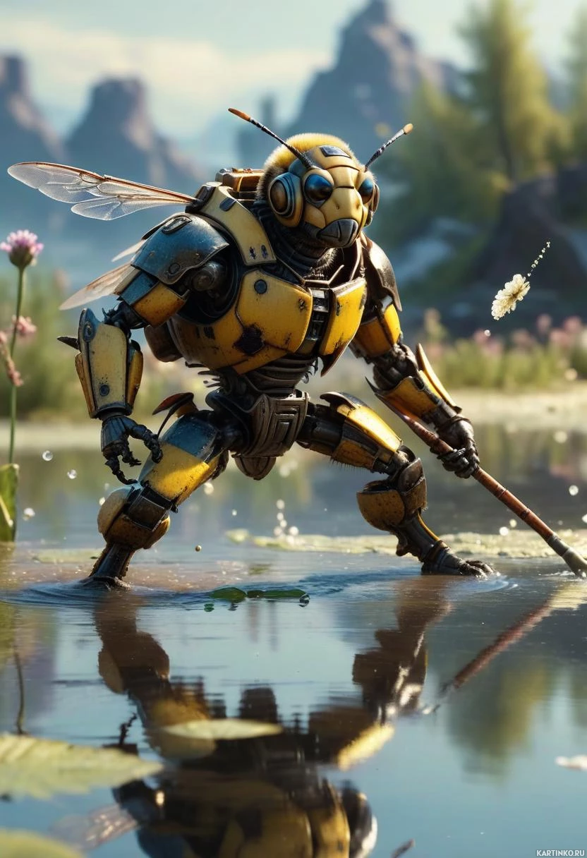 mechanical components integrated into its design. It's holding what seems to be a fishing rod, suggesting