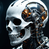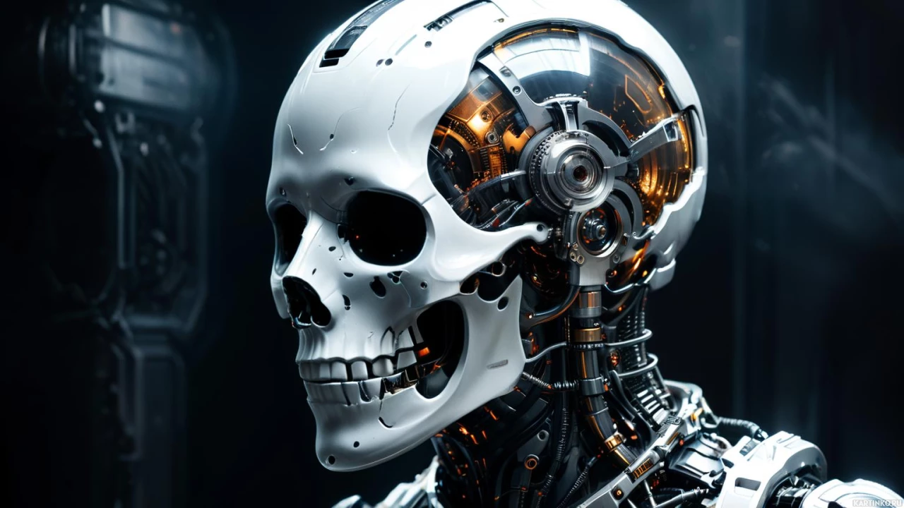 The image depicts a robot with a skull-like head and
