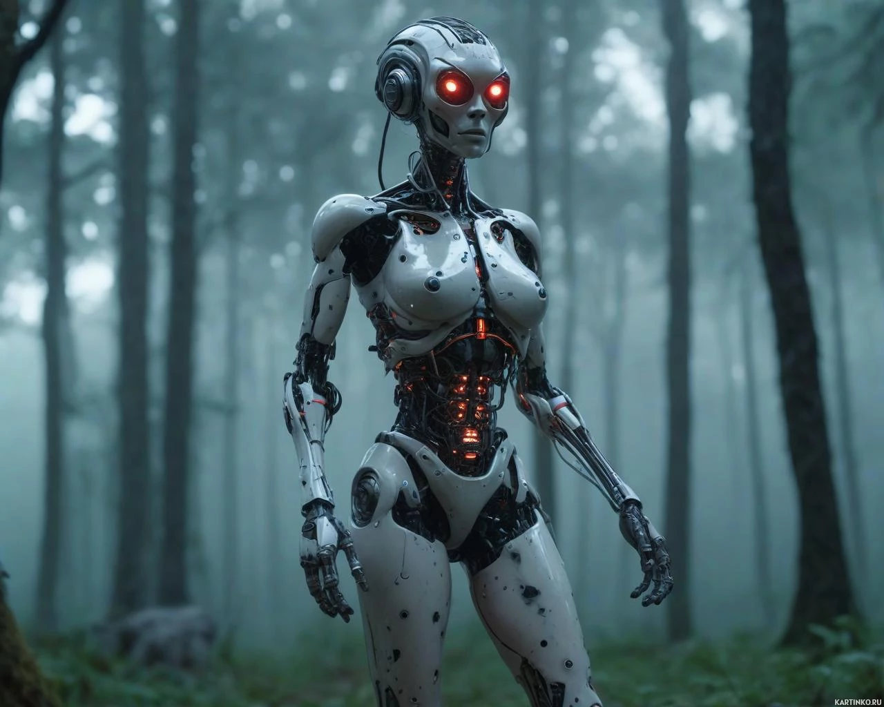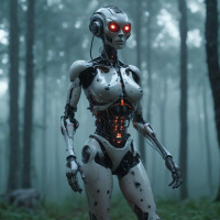 a robotic figure in what appears to be a misty, forest-like environment. The robot has humanoid proportions with visible mechanical and electronic components that suggest
