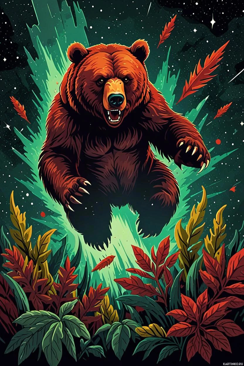 The image features a stylized, fantastical depiction of an animal, specifically a bear. The bear is standing upright on two legs with