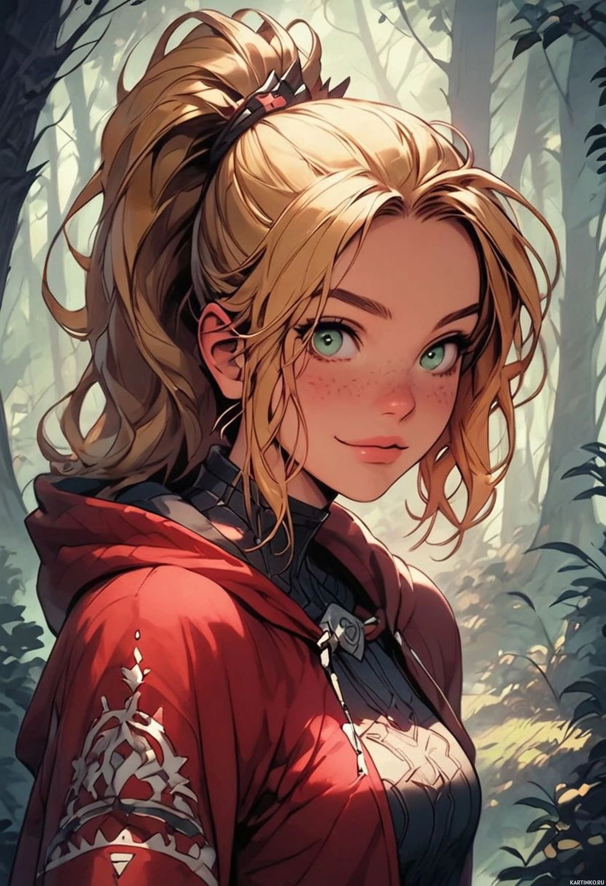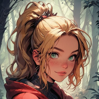 natural setting with trees and foliage, indicating that the character might be in an outdoor environment, possibly within a fantasy or adventure-themed context. The overall style of the image is reminiscent of a high-quality digital painting often seen in modern graphic design and illustration for