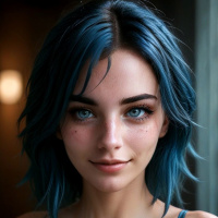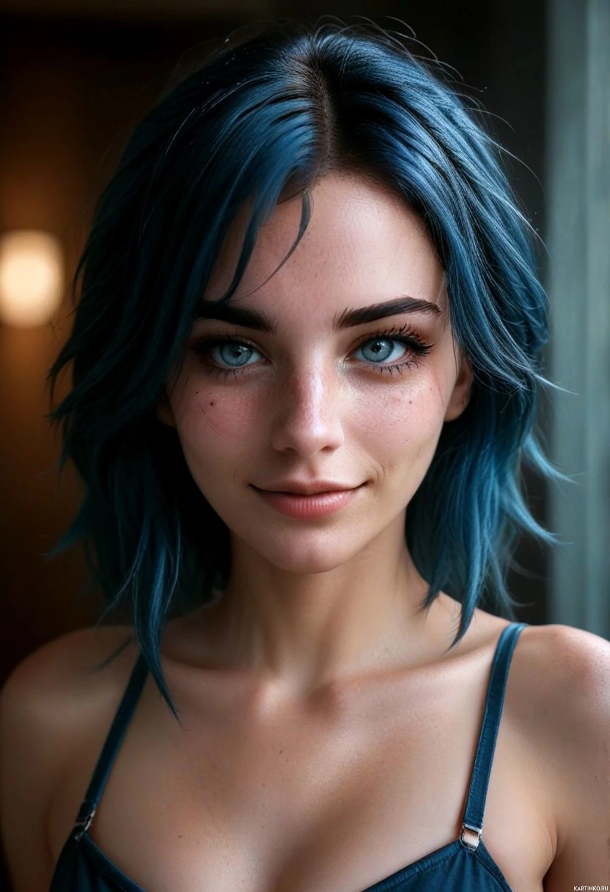 a young woman with short blue hair styled to look messy and wind-blown. Her eyes are