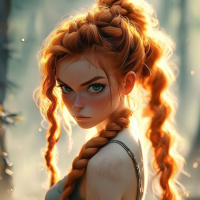 a female character with vibrant red hair styled in braids. She has