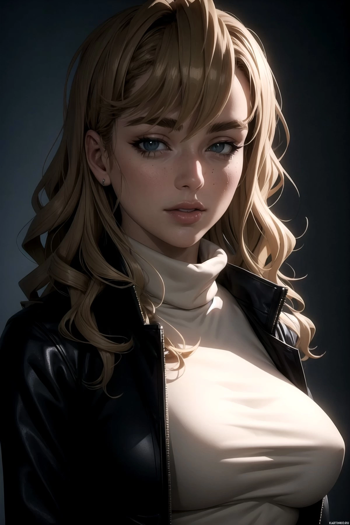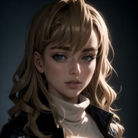 a young woman with blonde hair. She has a youthful and stylized appearance, with large