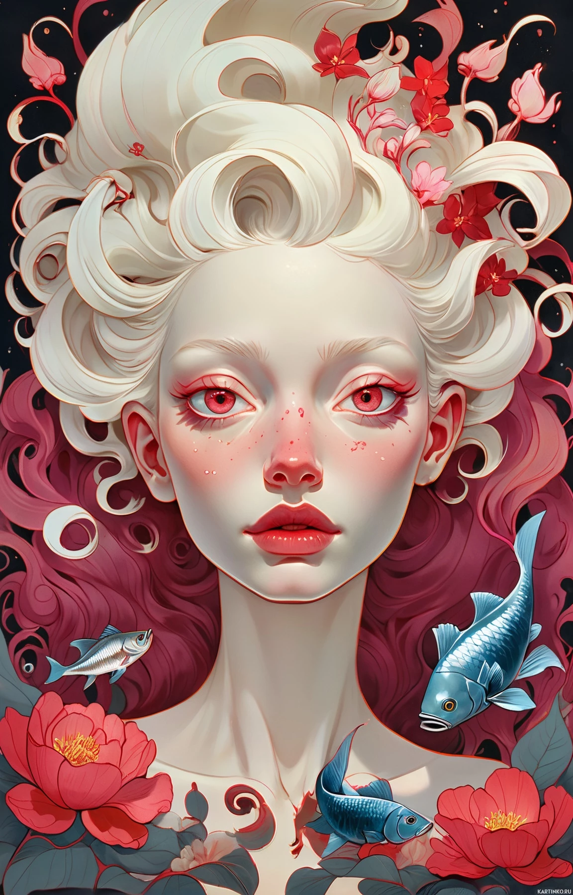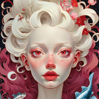 pink markings around her eyes that give the appearance of stylized eyeliner. The character is adorned with floral elements; there are small red flowers on her face, which could be