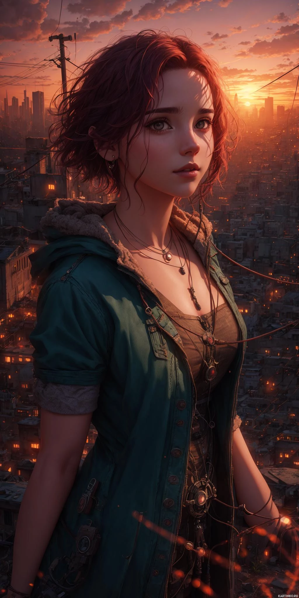 red hair and is wearing what appears to be a steampunk-inspired outfit with various metallic and mechanical elements. Her expression is thoughtful or contemplative as she gazes off into the distance, which is depicted as