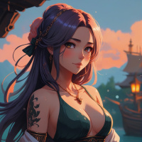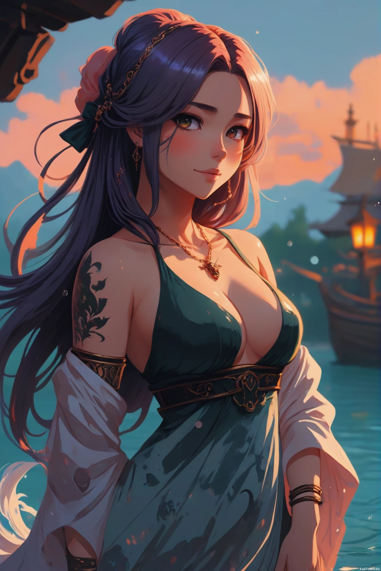 pink flower adorns her head, perhaps indicating a special occasion or simply serving as an accessory. The setting seems serene with a body of water visible in the background, and boats are anchored nearby, contributing to