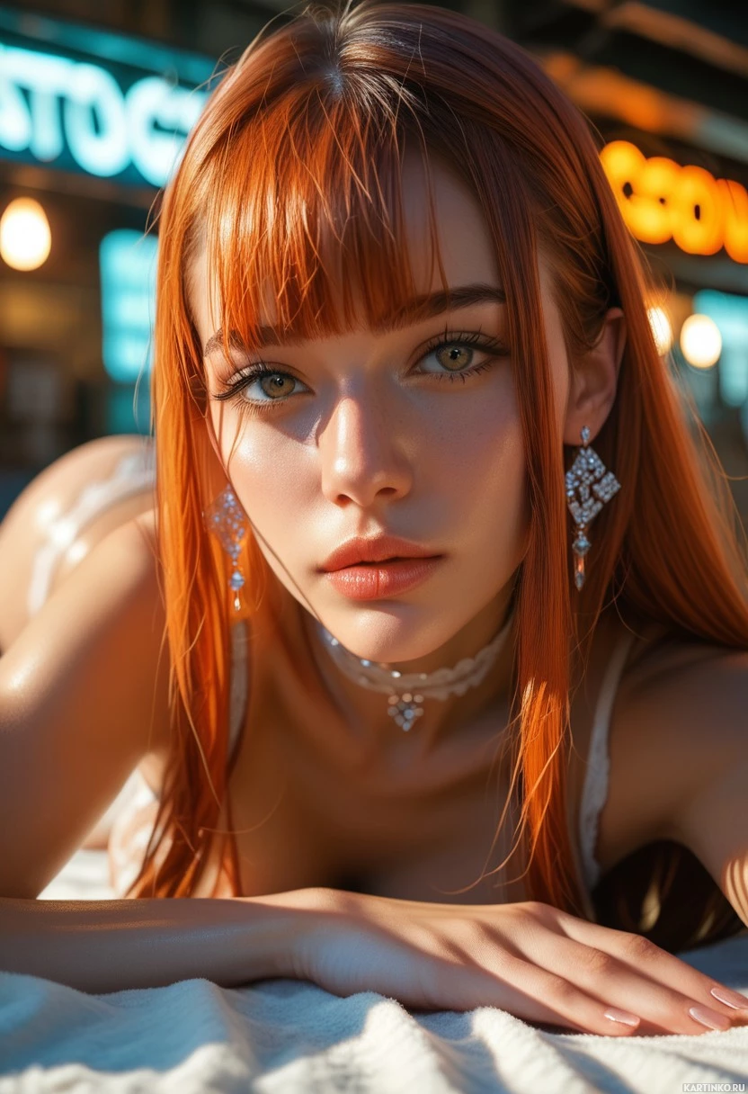 a sleeveless top or dress, possibly made of silk or satin, which hugs her curves in all the right places. The fabric appears to be lightweight and flowing, with intricate patterns or designs that add visual interest to the overall look. Her arms are bare, showcasing her toned muscles and slender wrists. In the background, the setting is not clearly defined, but it appears to be a bustling city street or urban landscape. Neon lights and signs can be seen in the distance, casting a colorful glow over the scene. The atmosphere is lively and energetic, with people milling about in the distance. Overall, the image presents a captivating portrait of a young woman who exudes confidence and poise. Her striking features, elegant attire, and dynamic setting combine to create a visually stunning image that draws the viewer's attention.