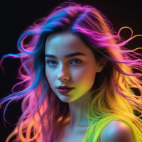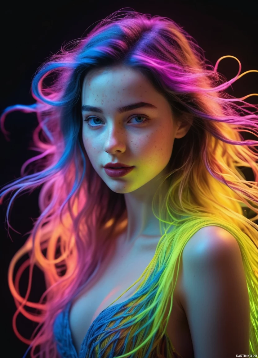 vibrant hair in shades of pink, blue, and purple that cascades down her shoulders. Her skin is pale, and she has