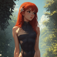 На картинке изображена девушка с рыжими волосами, сидящая на видном камне или выступе в лесистой местности. На ней чёрный облегающий костюм, одна нога слегка вытянута. Выражение лица нейтральное, рядом с ухом – маленький белый цветок. На заднем плане – природный ландшафт, зелень и спокойная атмосфера.