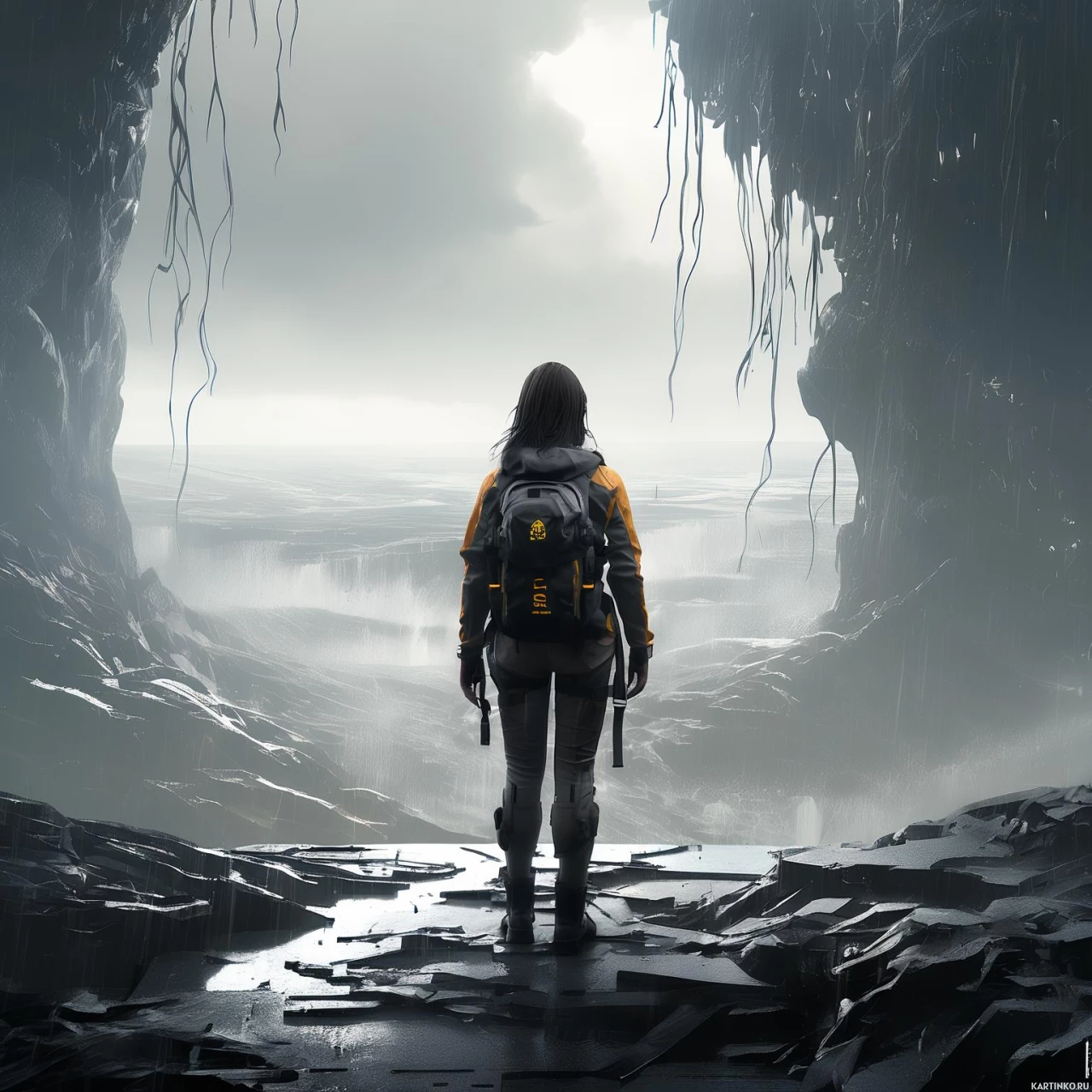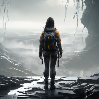 dark hair and is wearing a backpack that suggests she may be on an adventure or journey. The terrain surrounding her looks rugged and possibly mountainous, with icy or snowy surfaces suggesting cold