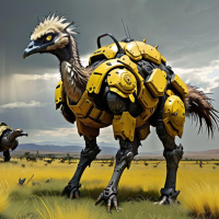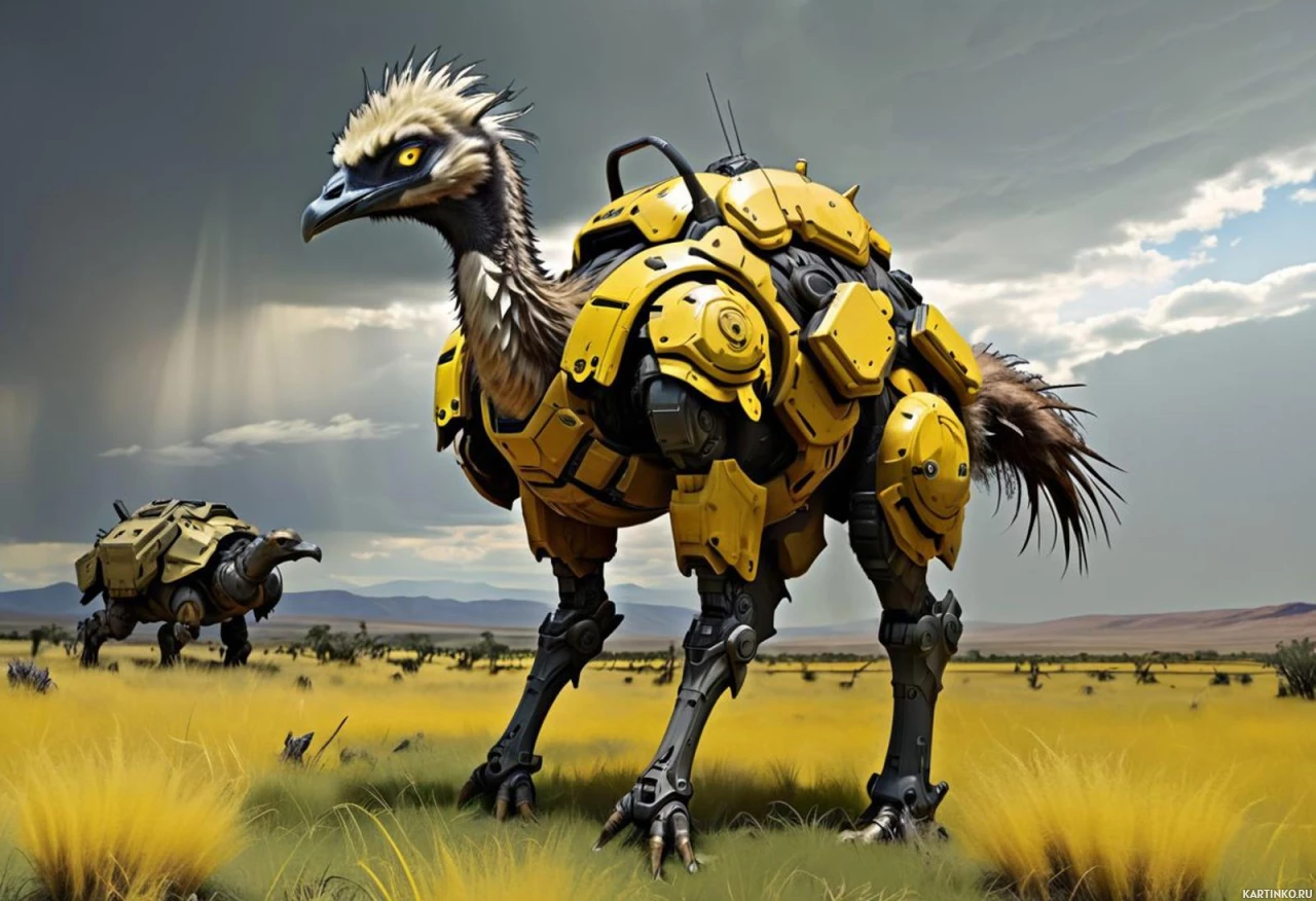 circuit boards, sensors, and possibly weapons or defensive mechanisms. The ostrich's feathers have been replaced by a smooth, metallic skin, giving it