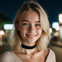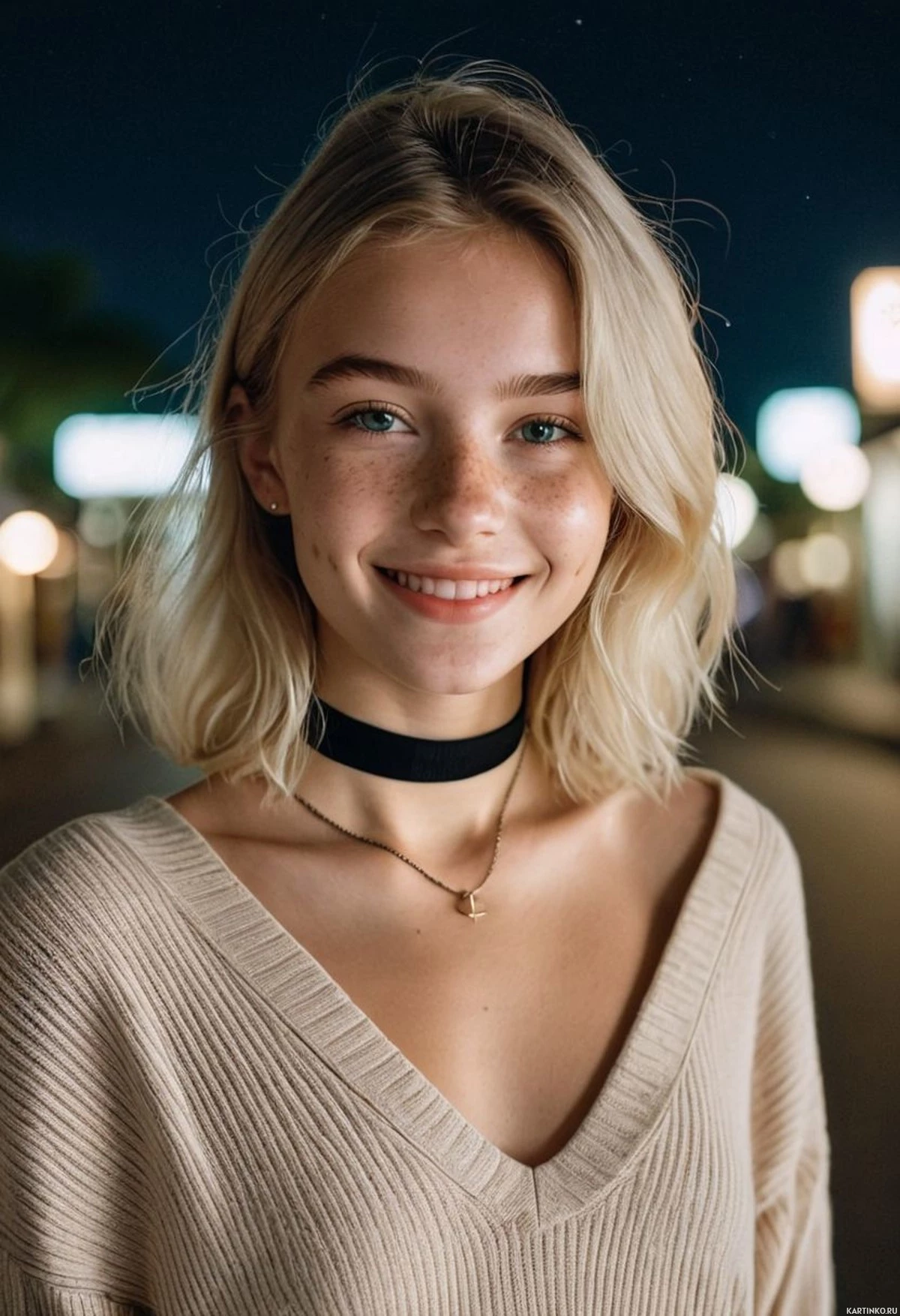 blonde hair and is wearing a knit sweater with a scoop neckline, layered under another garment that may be a cardigan or similar item. Her makeup includes