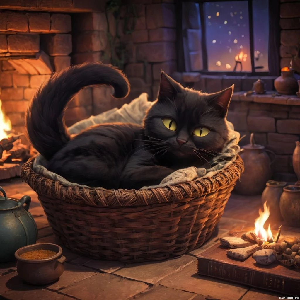 a cozy scene with an animal, specifically a cat. The cat is black and sits comfortably in a basket placed on a tile floor. The basket itself appears to be woven and has a cloth or napkin tucked inside it. The room has