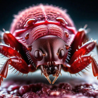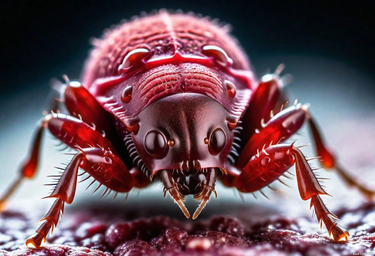 a natural setting with a brownish-grey color palette that contrasts with the vibrant red of the beetle. The overall style of the photograph is realistic with an emphasis on detailing the features and textures of the insect's exoskeleton and