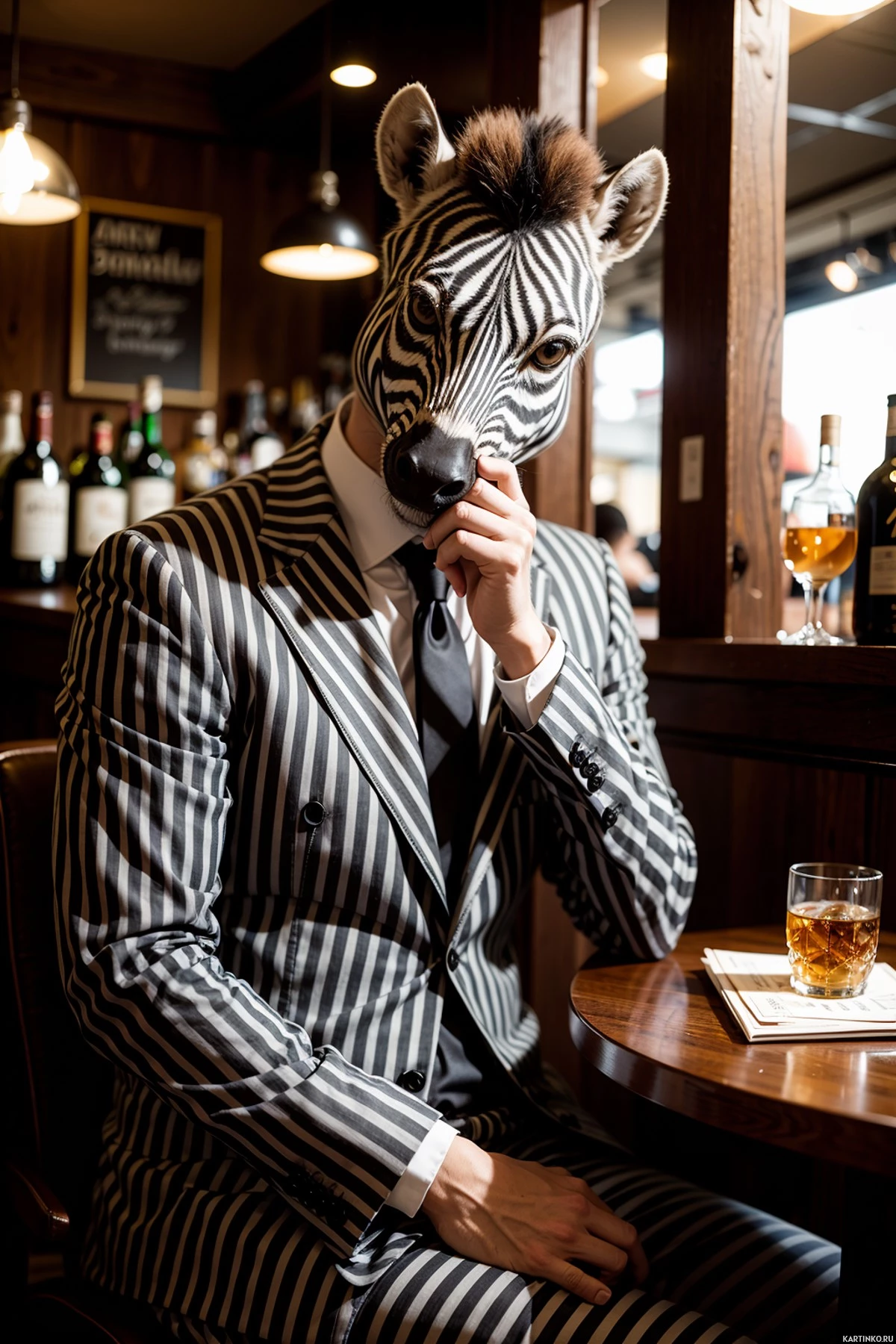 zebra mask. The mask covers their entire head and features markings that resemble those of a zebra, including the black and white stripes. The person is seated at a bar or restaurant setting, as evidenced by