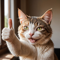 hand gestures, giving the impression that it's "thumbs up" or positively approving something. The cat is looking directly at the camera with