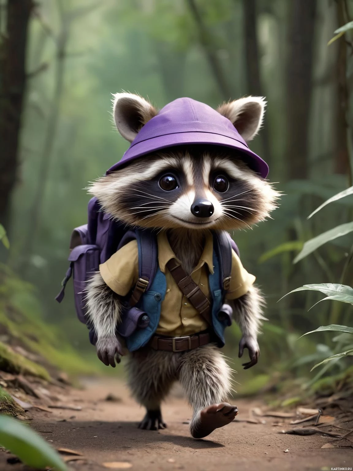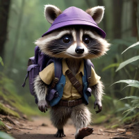 an anthropomorphic raccoon, a character often referred to as a "raccoon-like creature" due to its cartoonish design. This creature is standing on all fours and wearing a purple backpack, which suggests it might be going on an adventure or journey. It's also wearing a blue cap and has