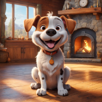 warm lighting and a fireplace in the background. The dog is smiling and seems to be enjoying itself, possibly playing or waiting for someone to return home. The art style suggests it could be from