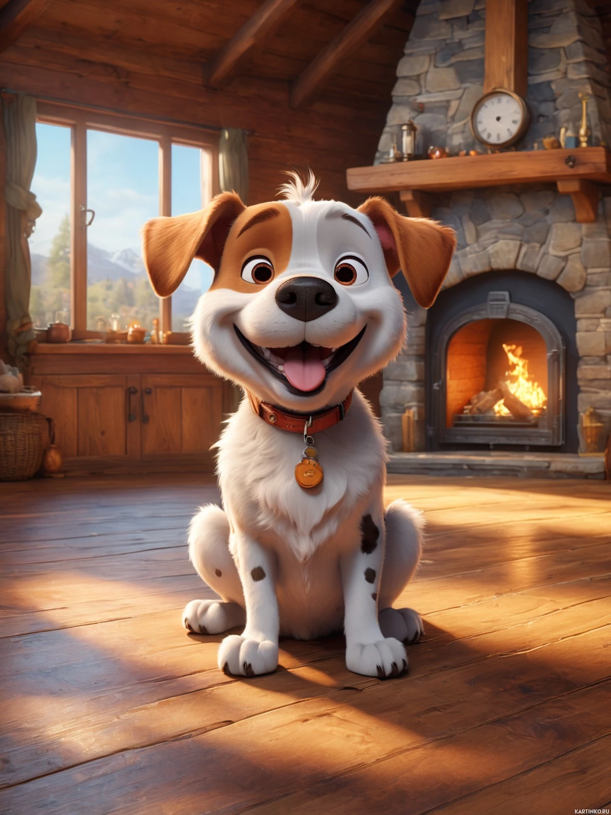 a cartoon dog sitting on wooden floor indoors. It appears to be a cozy, rustic setting with