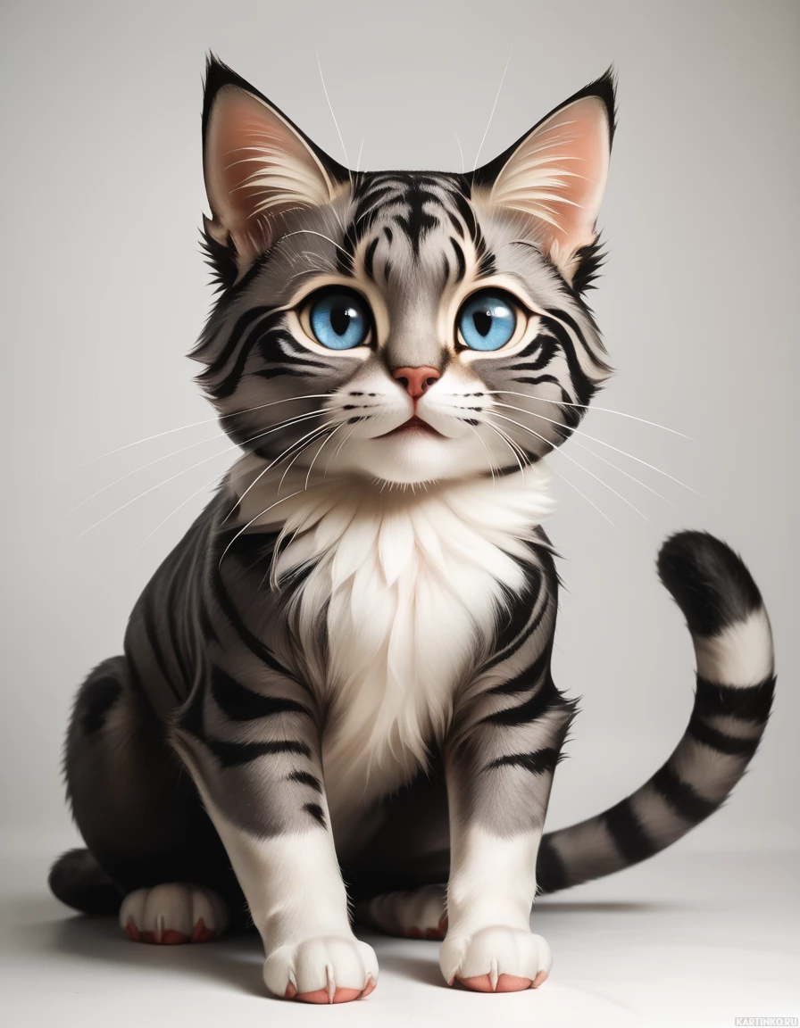 blue eyes. Its fur has various shades of grey, white, and black stripes that are characteristic of the breed. The cat is sitting upright on its