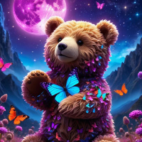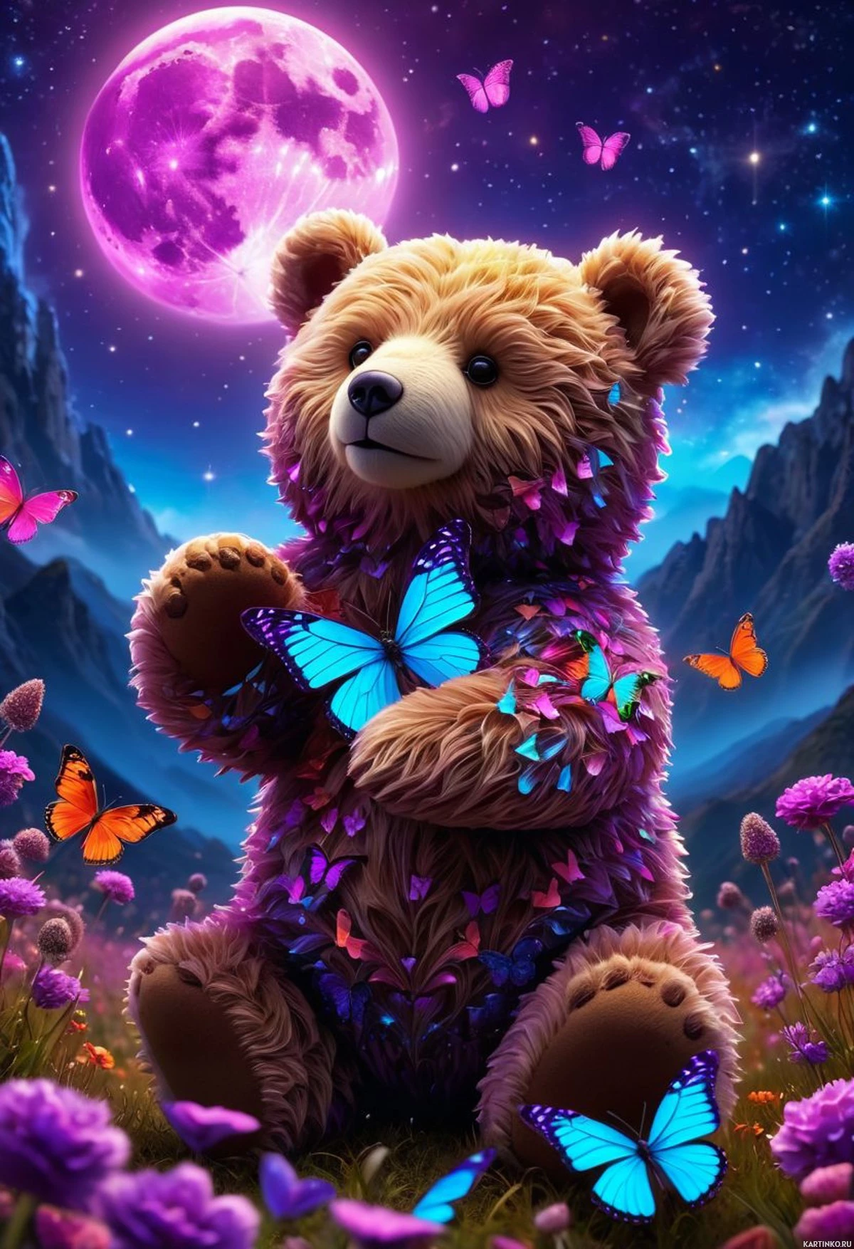 pink flowers and butterflies around the bear, adding to the whimsical atmosphere of the image. The colors used are soft and pastel-like, giving the image a gentle and calming vibe.