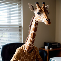 visual effect, as it combines human facial features with a giraffe's neck. The setting suggests an indoor office or