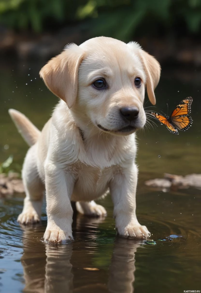 shallow water. The puppy appears to be looking directly at the camera with its head slightly tilted as if it is examining something out of view. On its back, there is a small orange butterfly that seems calm and undisturbed by the presence of the dog. The setting looks like