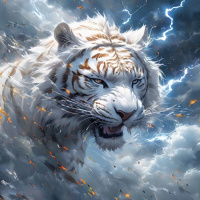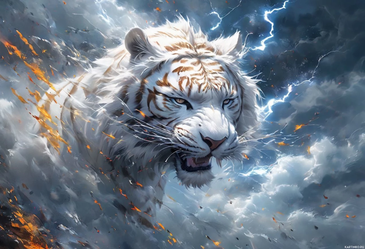 lightning bolts, suggesting an element of danger or confrontation. The ground beneath the tiger seems to be