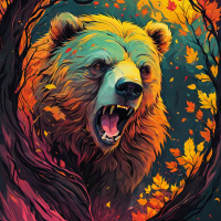 The image features a stylized illustration of a bear. The bear is depicted with its mouth open, appearing to roar or growl, and has a somewhat