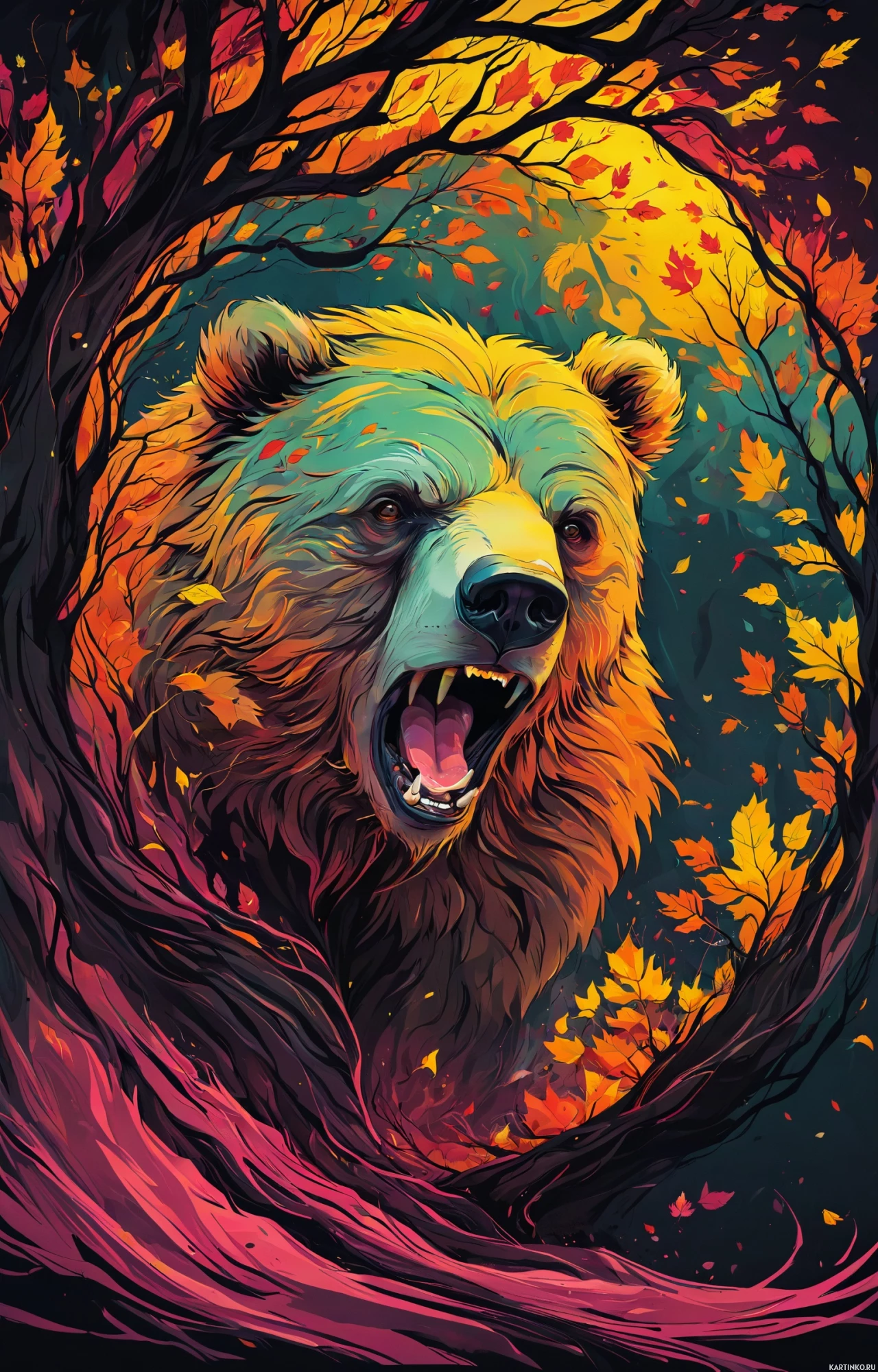 the grizzly bear. Surrounding the bear are autumn-themed elements; there are leaves in hues of orange, yellow, and red, suggesting a seasonal theme consistent with