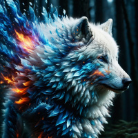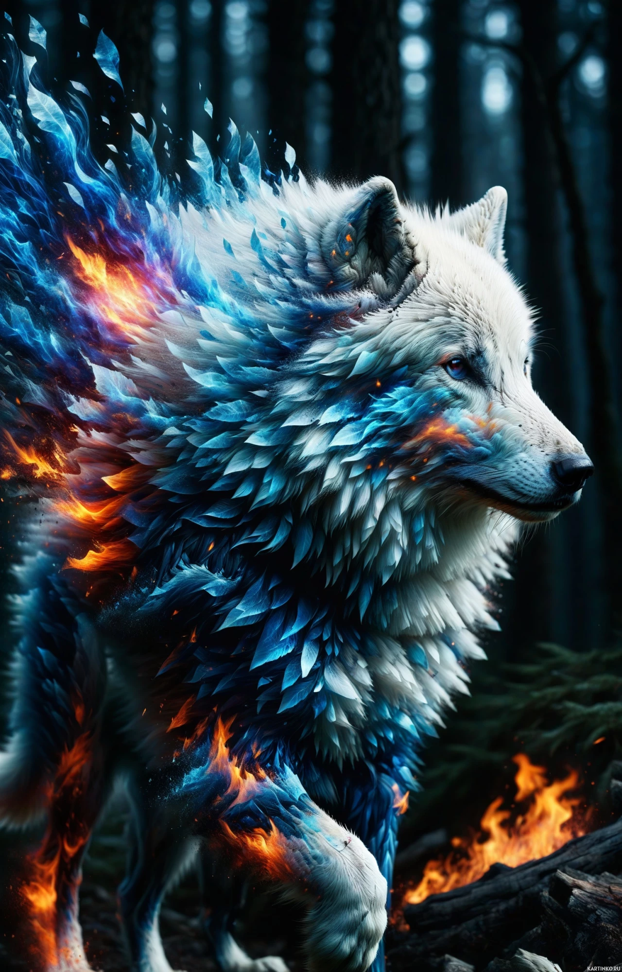 colorful fire-like design is not typical of wolves in nature and adds to the fantastical element of the creature. The background depicts