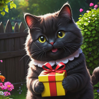black cat with striking yellow eyes. The cat is standing on all fours, and its fur appears to be glossy and well-groomed. It's holding an unopened gift box in one paw, which has
