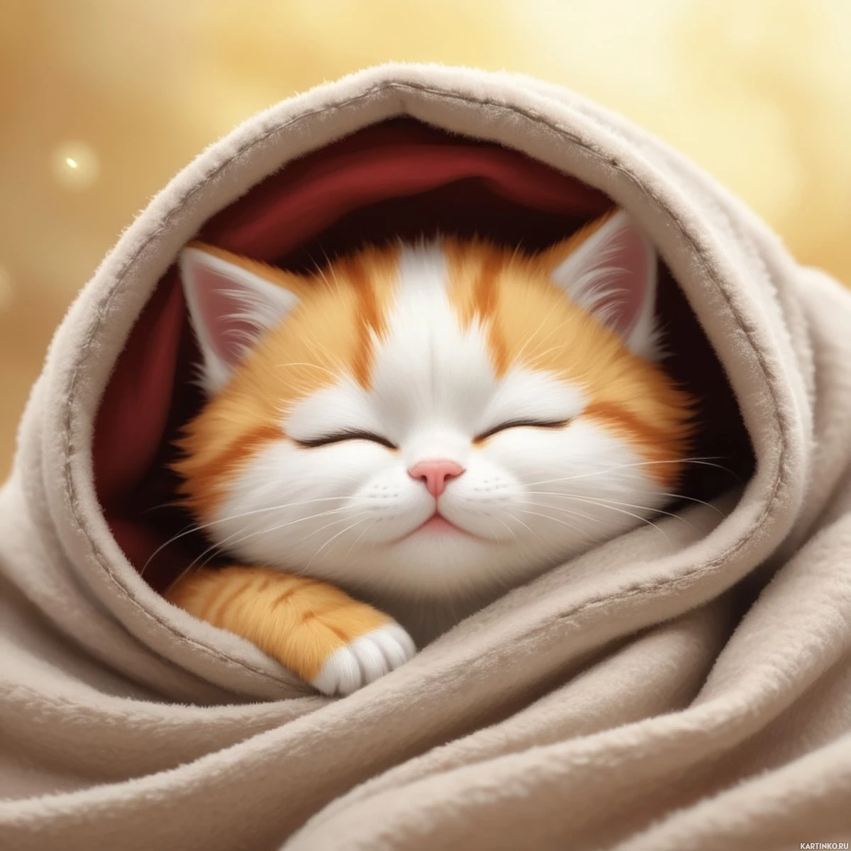 tabby cat nestled comfortably inside an oversized pillow or blanket. The cat's eyes are gently closed in