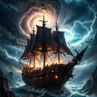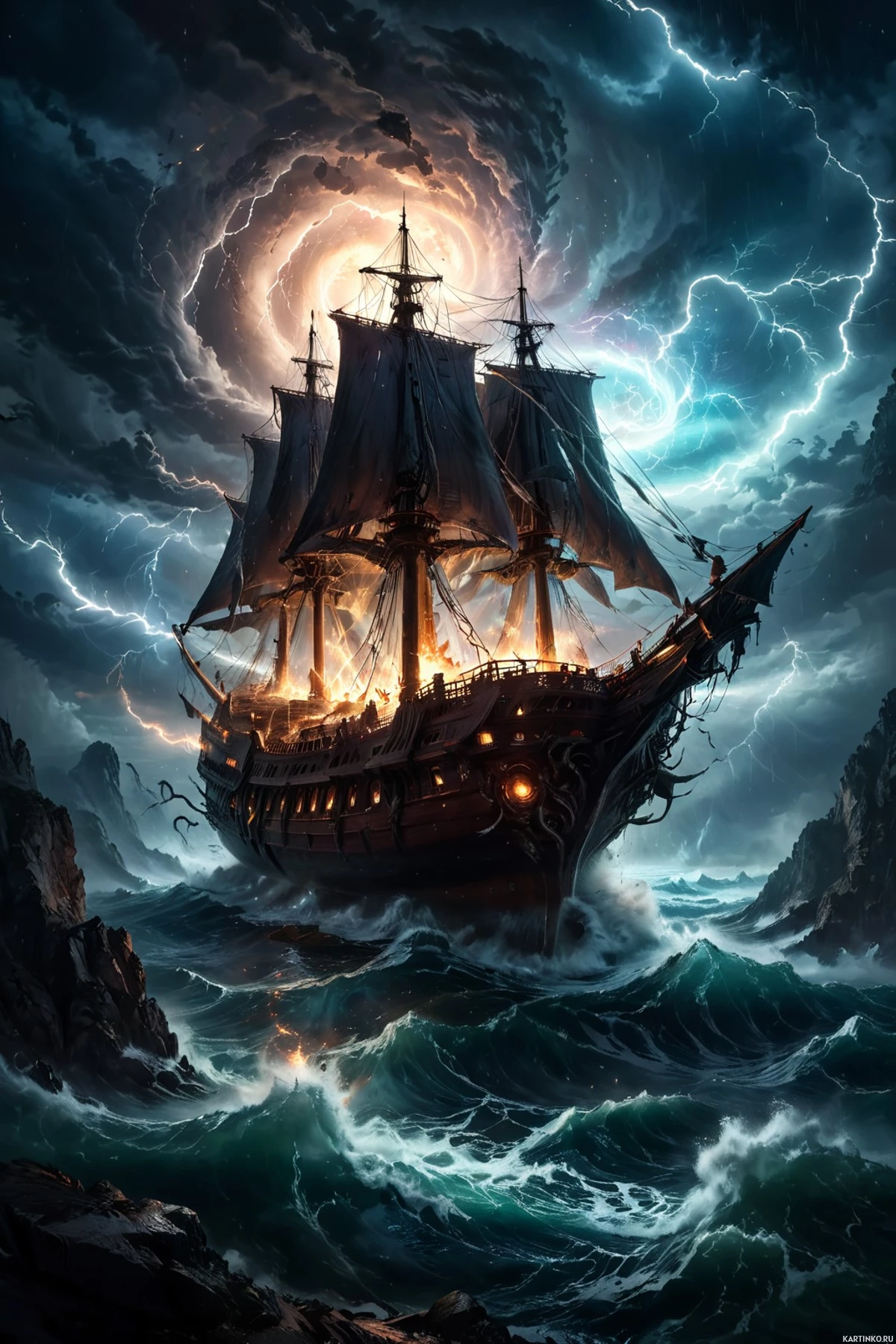 swirling clouds, giving the impression of a tumultuous sea storm. The ship is surrounded by rocks and