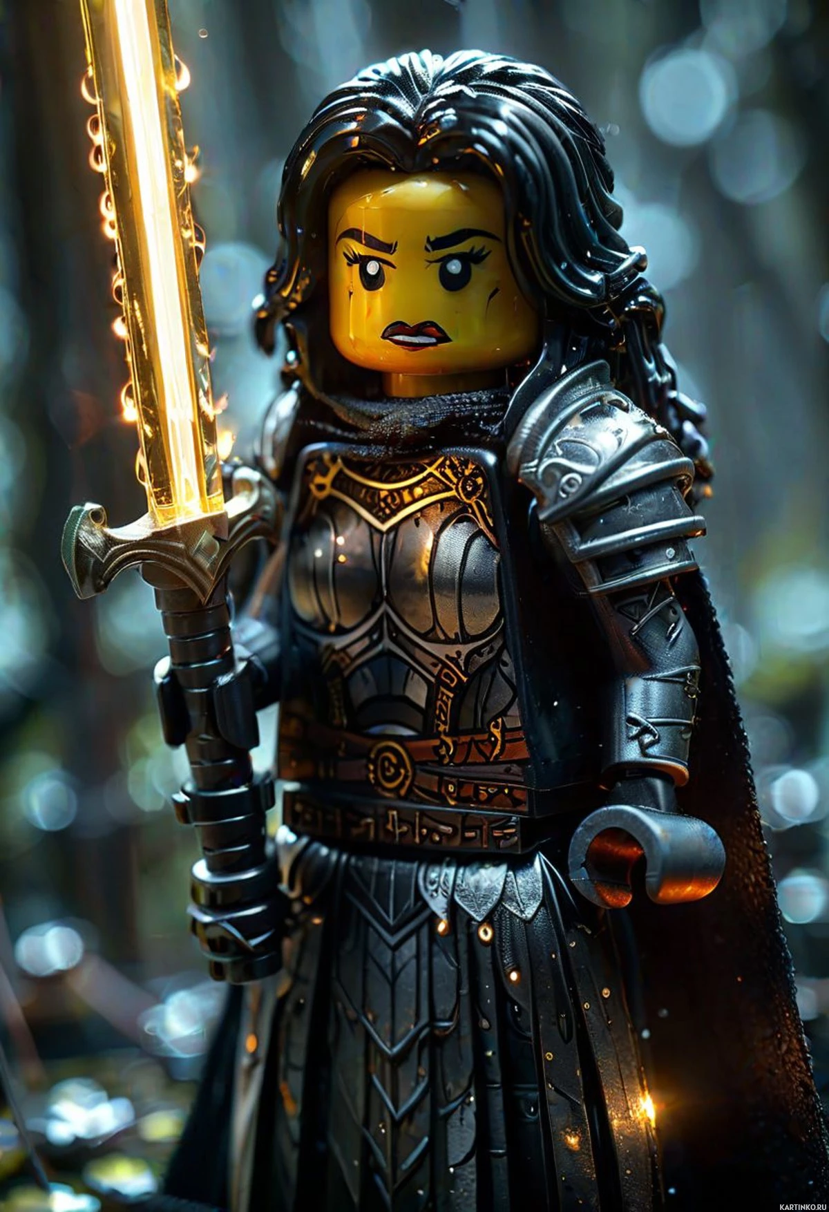 a chainmail skirt and has a tunic with what seems to be a design that might indicate royalty or nobility. The Lego figure itself has facial expressions that convey emotion, like a frown, which adds to