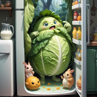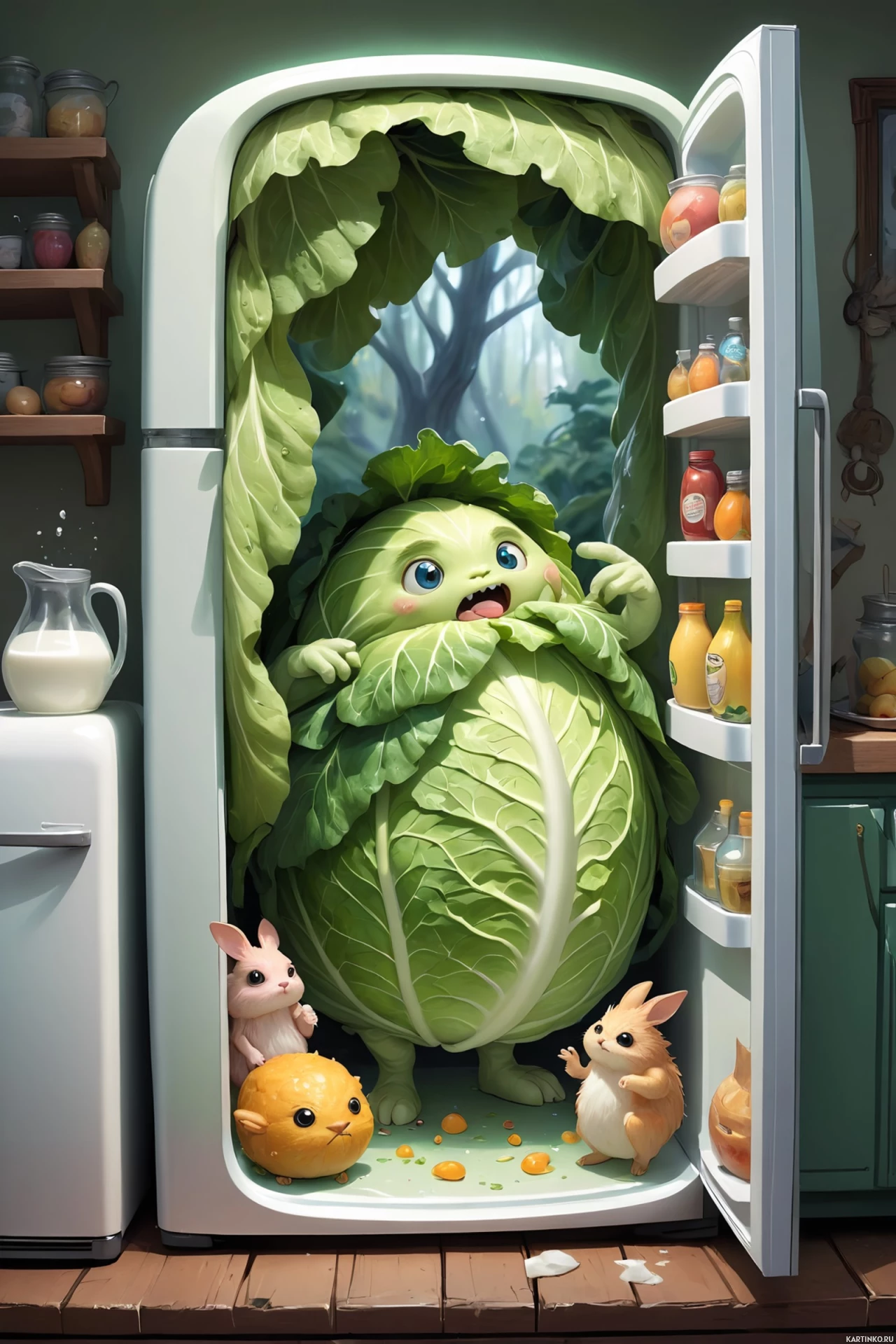 an animated character, who appears to be a large, anthropomorphic cabbage with arms and legs, peeking out from an open refrigerator. Inside the fridge, there are other items such as a carrot and a bottle labeled "Milk." The fridge itself is white and has two shelves on the top compartment, each holding