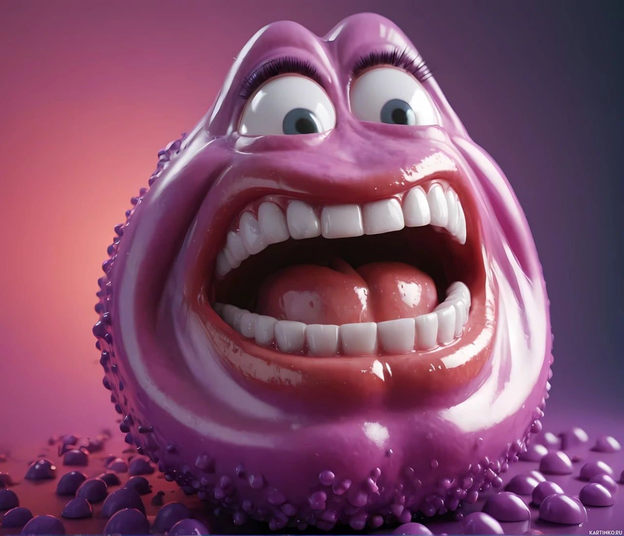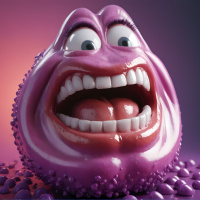 The image depicts a cartoonish representation of a virus. It features an exaggerated face with