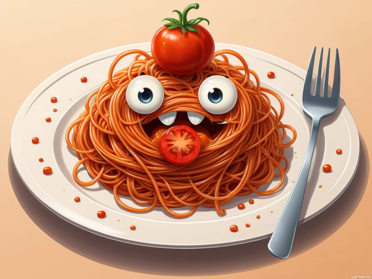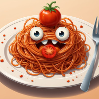 The image depicts a plate with spaghetti, accompanied by what appears to be an animated tomato. The plate is white and there's