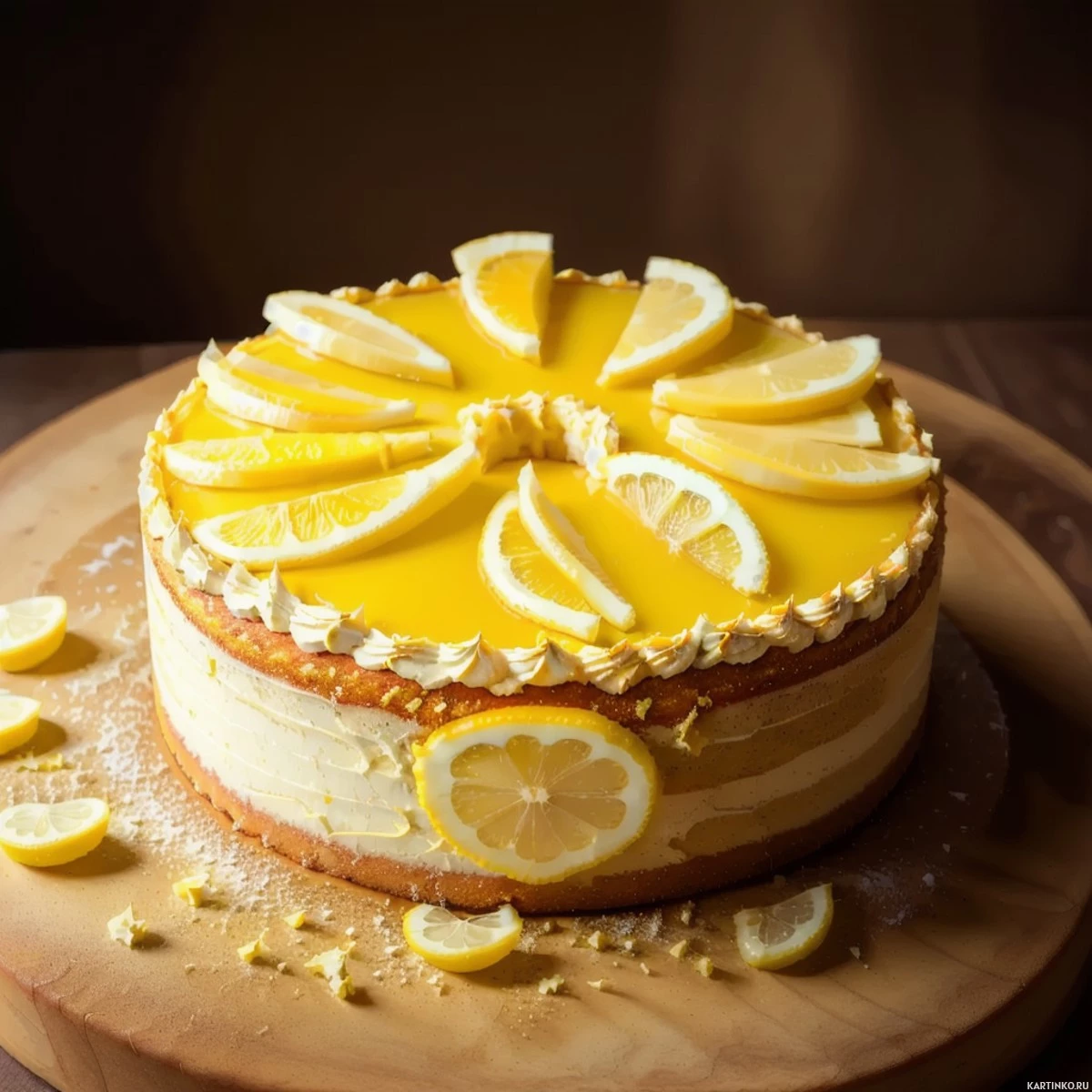 the top layer, suggesting a combination of sweetness from the cream and tartness from the fruit. The cake is decorated with a ring of lemon slices around its circumference, adding both