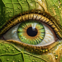a mythical creature. The paint is applied in such a way as to mimic the appearance of wetness or dew on the skin surrounding the eye, which adds an element of shine and reflectiveness. The overall impression is one of