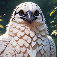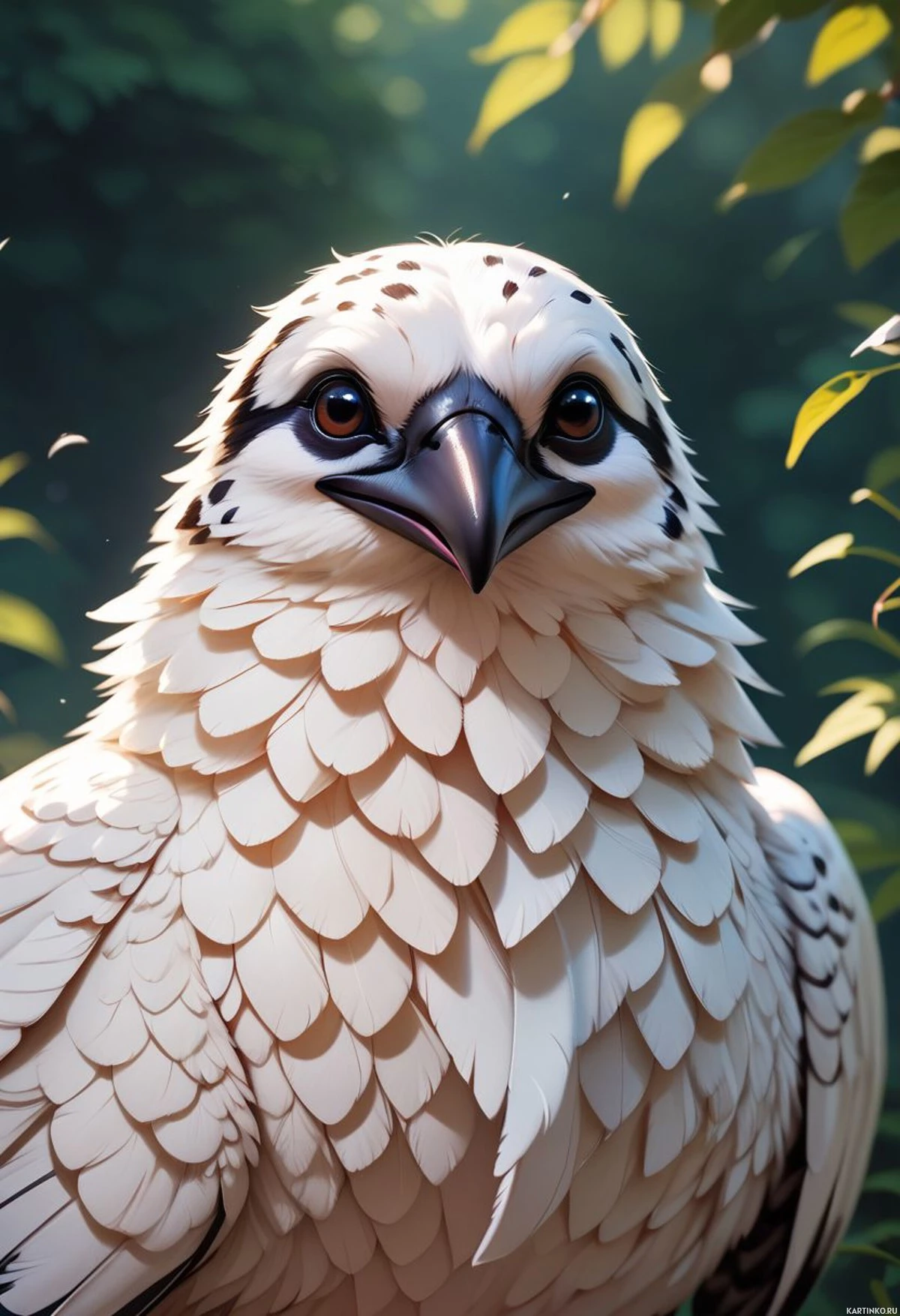 На картинке изображена величественная птица с яркими оранжевыми глазами и белоснежными перьями, украшенными черными пятнышками. Она стоит в лесистой местности, окруженная зелеными листьями, которые создают естественную атмосферу.
