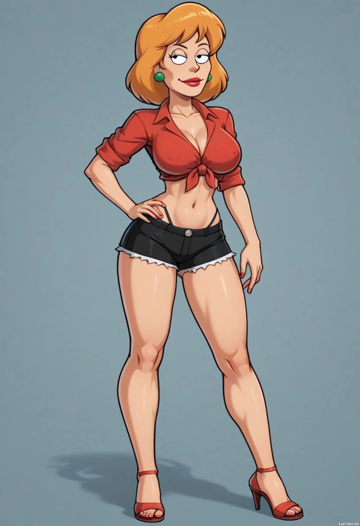 На картинке изображена женщина, стоящая на однотонном фоне. У неё короткие, кудрявые рыжие волосы и макияж с акцентом на ресницы и помаду, идеально сочетающуюся с её тоном кожи. Она одета в топ без рукавов с глубоким вырезом и облегающие брюки с высокой талией, заканчивающиеся чуть выше колена, демонстрирующие её подтянутые ноги и икры. На ней также туфли на тонких ремешках с открытым носом, достигающие щиколотки. Её осанка выражает уверенность: одна рука лежит на бедре, другая — на бедре. Поза, наряд и макияж указывают на стиль, типичный для моды или моделинга.