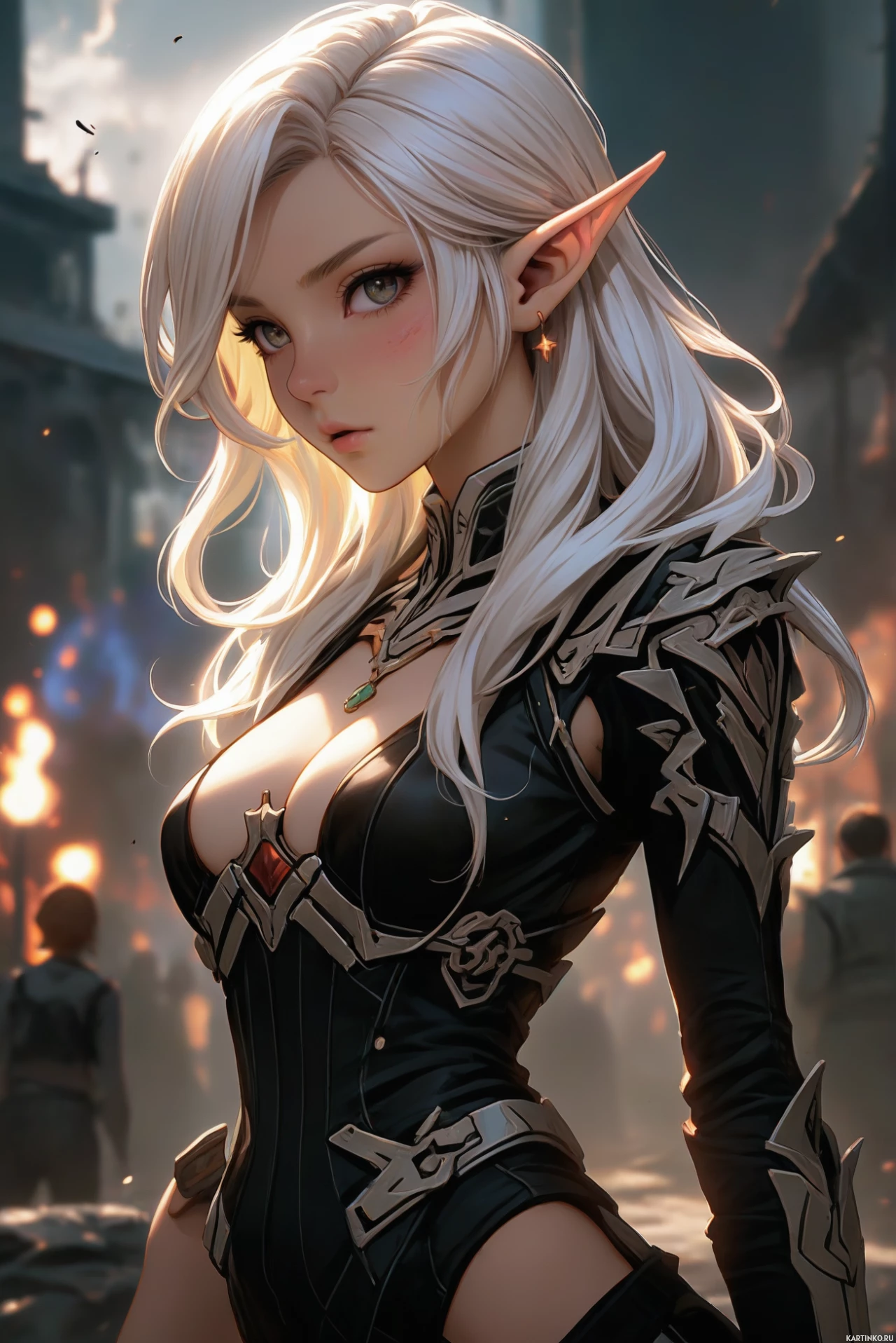 an urban street with archways and lamps, which contrasts with the magical nature of the elf. There are also other characters in the image, but they are not as prominently featured as the central
