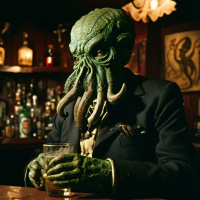The image features a man dressed as an alien or monster, reminiscent of those found in fantasy literature and media. He is seated behind a bar counter, which is equipped with